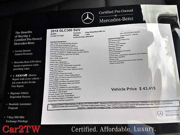 2018年最新款賓士 GLC300美國賓士原廠認證中古車(CPO: Certified Pre-Owned)
