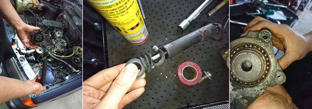 目視引擎裏頭的皮帶良好應與皮帶無關不需更換,由於賓士190E皮帶張力器老舊,橡膠老化,皮帶盤的滾珠軸程破損,Benz 190e 阻尼器漏油,上圖為檢查Benz 190e皮帶異音(左)Benz 190e張力器阻尼損壞情形(中)Benz 190e張力器總成(右)。