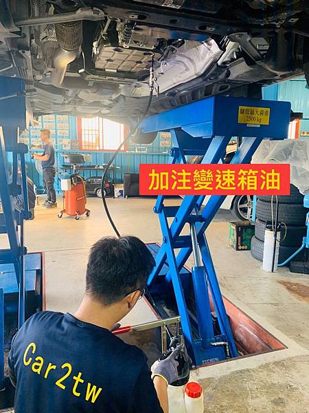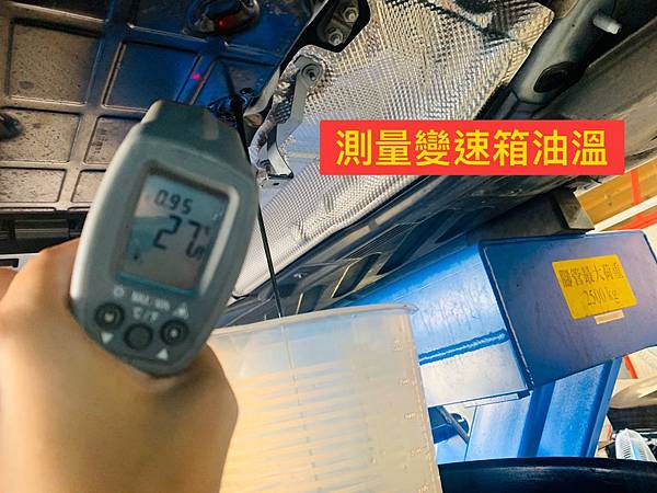 上圖為維修技師使用溫度槍確認溫度後,將更換前的舊變速箱油洩下