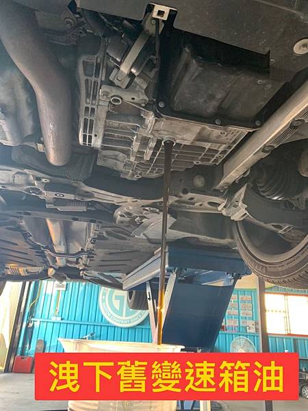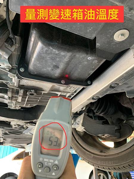 上圖為維修技師使用溫度槍確認降溫後,將更換前的舊變速箱油洩下