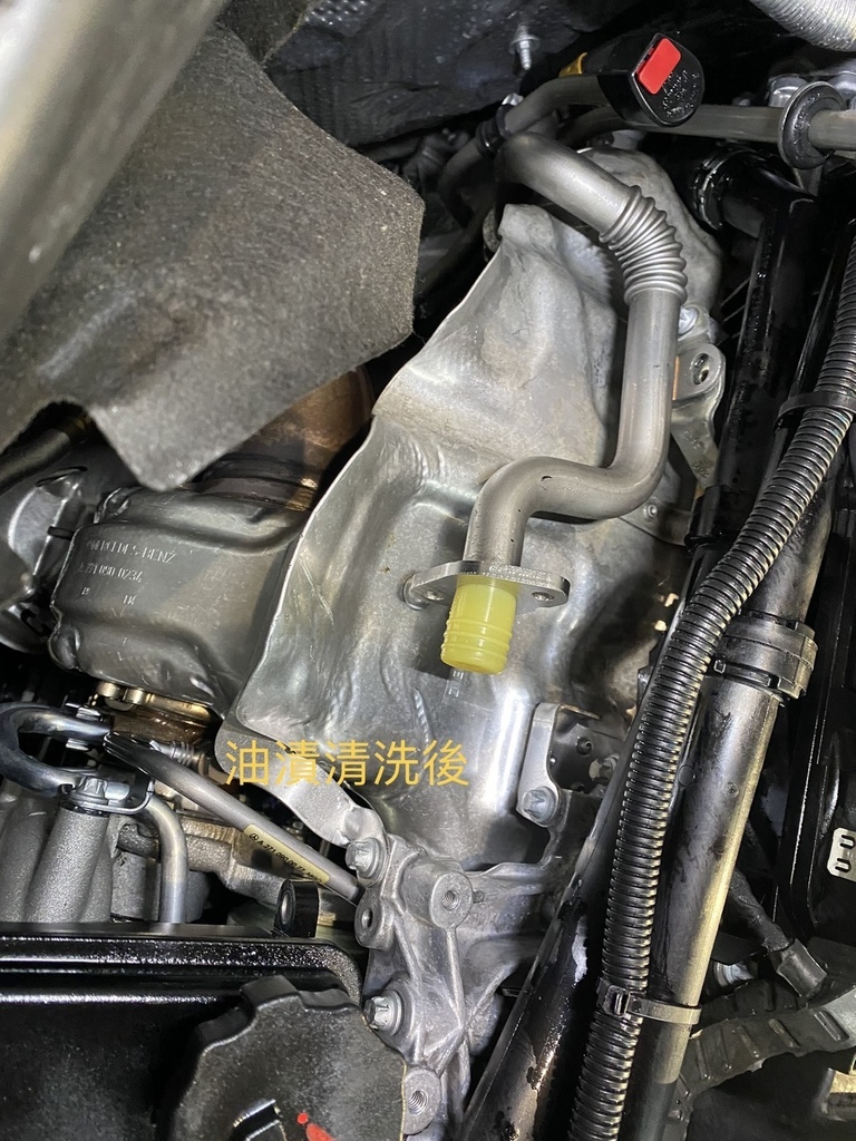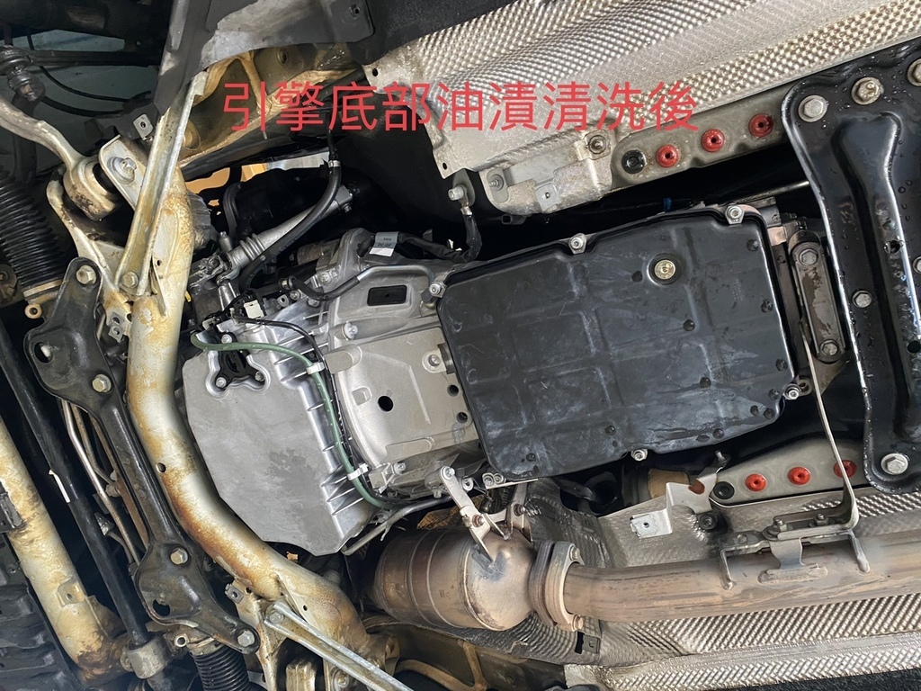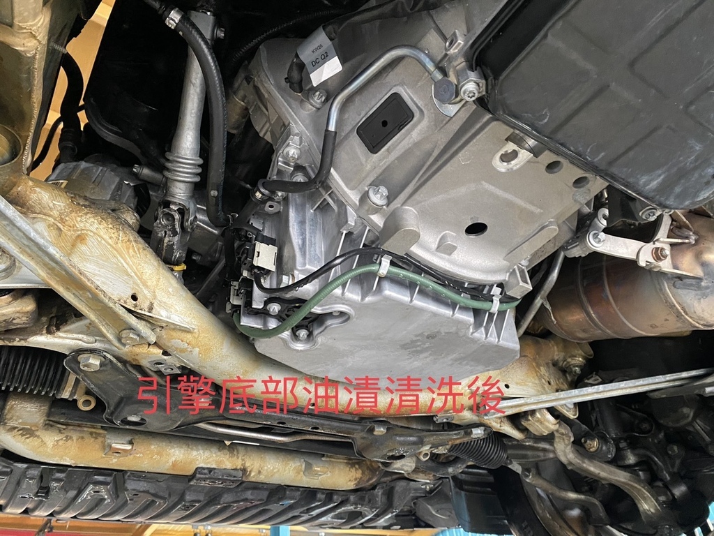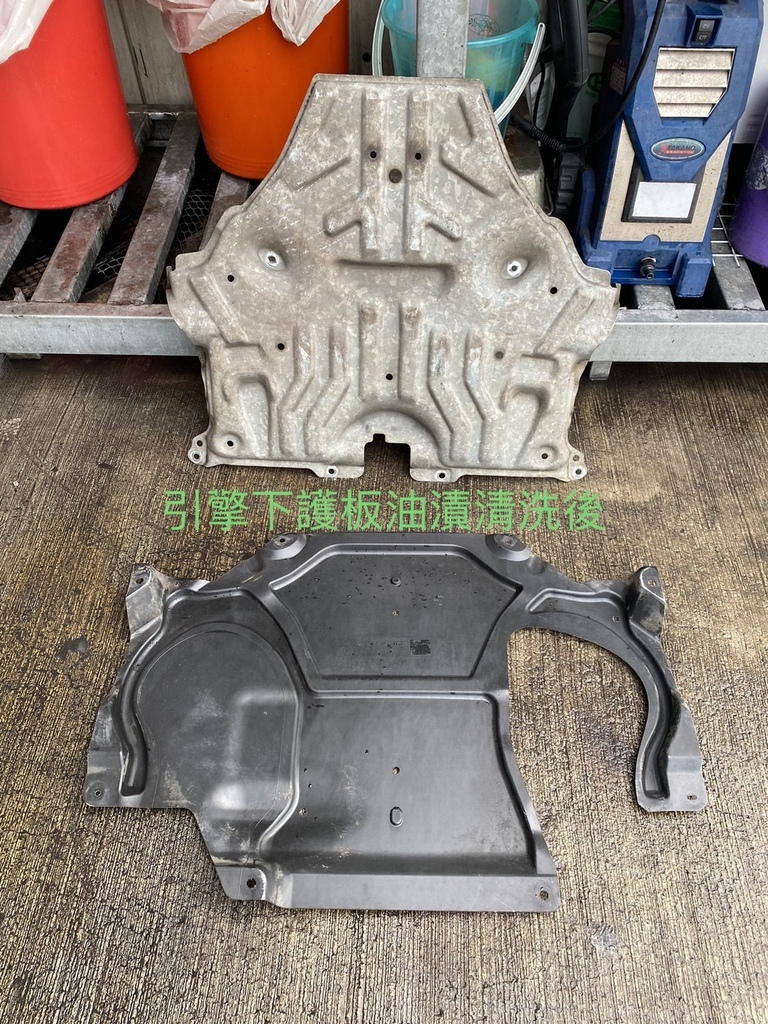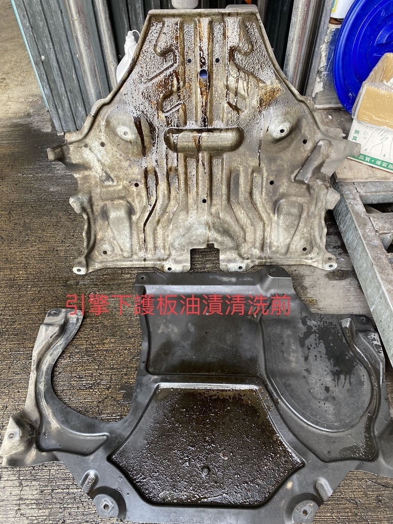 引擎下護板油漬清洗前可以看到明顯油漬殘留。